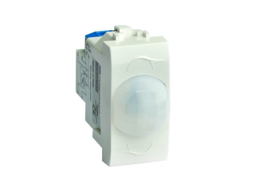 Инфракрасные выключатели (датчики движения и освещения). Назначение: управление освещением. Характеристики: номинальный ток − 16 А; номинальное напряжение − 250 B; встроенный таймер регулирует время включения (с выдержкой по времени); регулятор уровня освещенности помещения для установки степени затемнения окружающей среды (контрольное значение фонового освещения/затемнения); рабочее расстояние срабатывания − до 3 м; максимальное расстояние − до 6 м; возможно параллельное включение со вторым инфракрасным выключателем. Кол-во модулей: 1. Цвет: белый