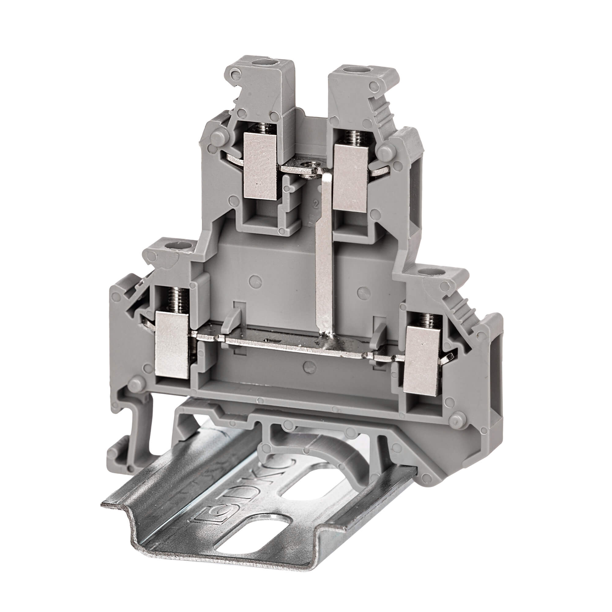 Клемма двухуровневая с винтовым зажимом предназначена для соединения четырех проводников. Монтаж на DIN-рейку OMEGA при температуре эксплуатации от -40 до +105°C. Корпус выполнен из ПА 6.6 с классом горючести V0 UL-94.