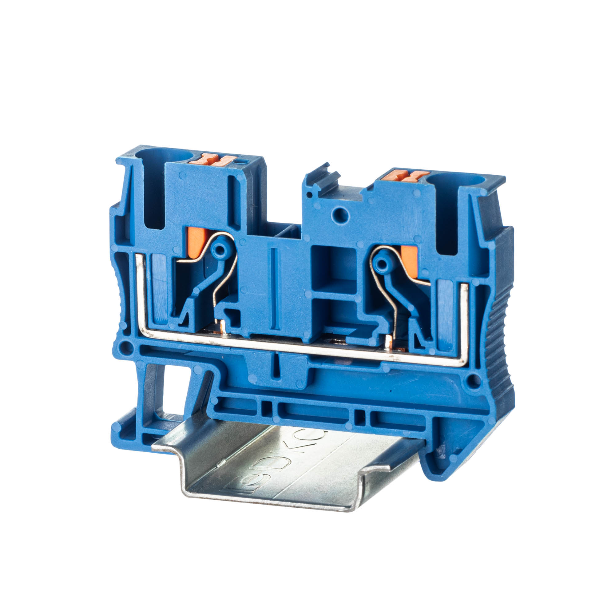 Проходная клемма с зажимом Push-in предназначена для соединения двух проводников, а за счет кнопки-толкателя обеспечивается защита от ошибок при монтаже и случайного прикосновения. Монтаж осуществляется на DIN-рейку OMEGA. Температура эксплуатации от -40 до +105оС. Корпус выполнен из ПА 6.6 с классом горючести V0 UL-94.