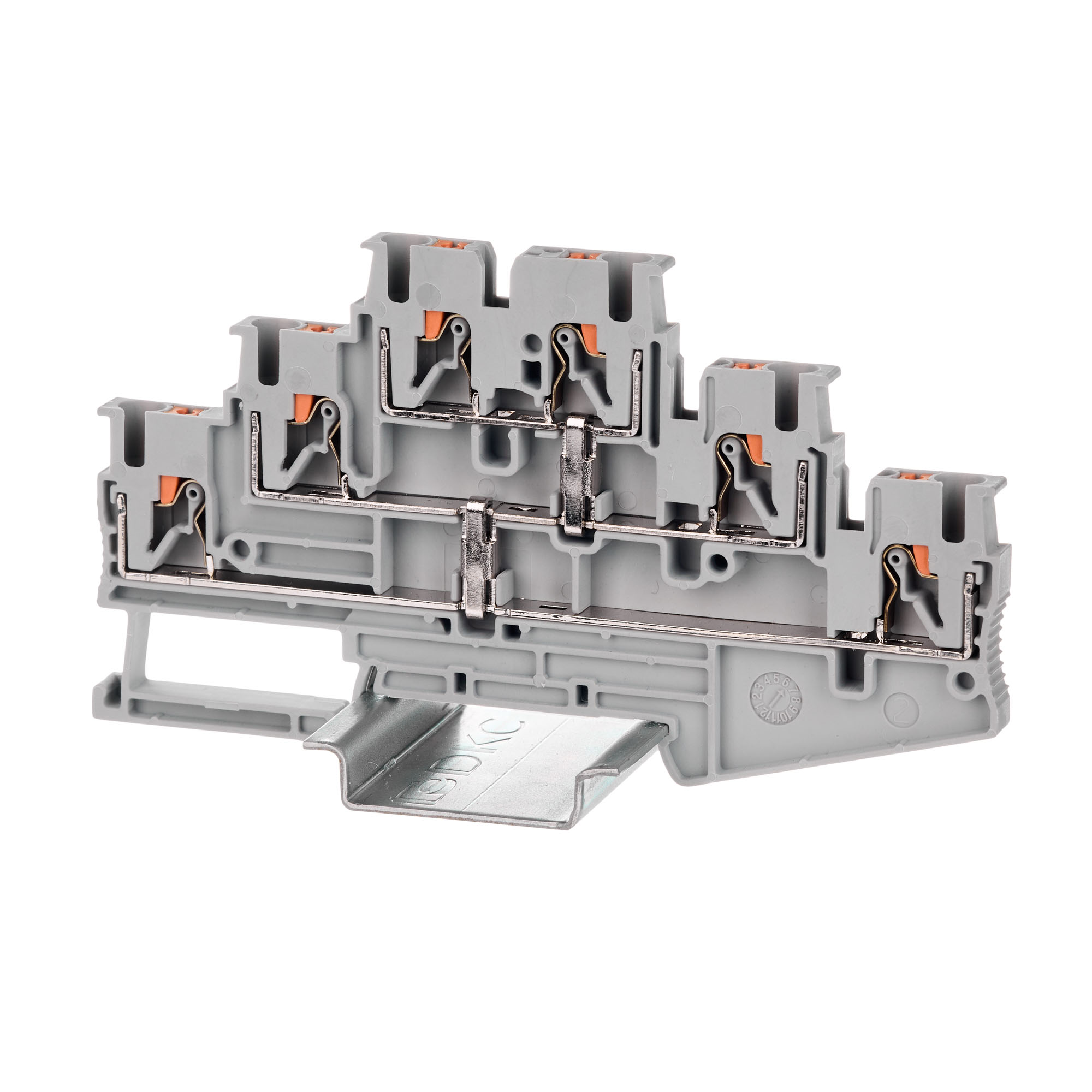 Клемма трехуровневая с Push-in зажимом предназначена для соединения шести проводников. Монтаж на DIN-рейку OMEGA. Температура эксплуатации от -40 до +105°C. Корпус выполнен из ПА 6.6 с классом горючести V0 UL-94.
