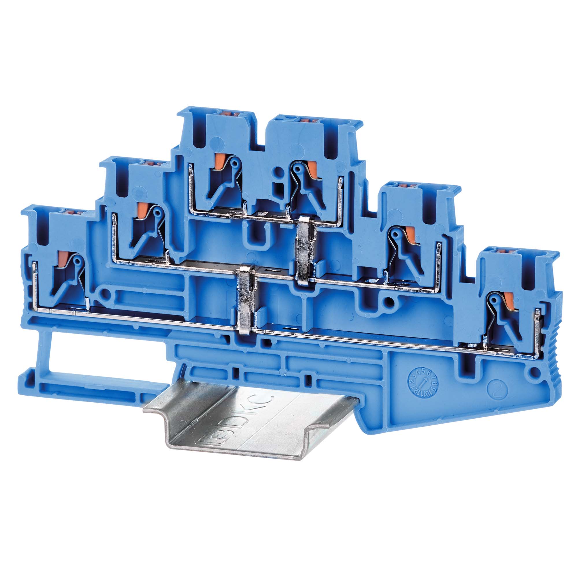 Клемма трехуровневая с Push-in зажимом предназначена для соединения шести проводников. Монтаж на DIN-рейку OMEGA. Температура эксплуатации от -40 до +105°C. Корпус выполнен из ПА 6.6 с классом горючести V0 UL-94.