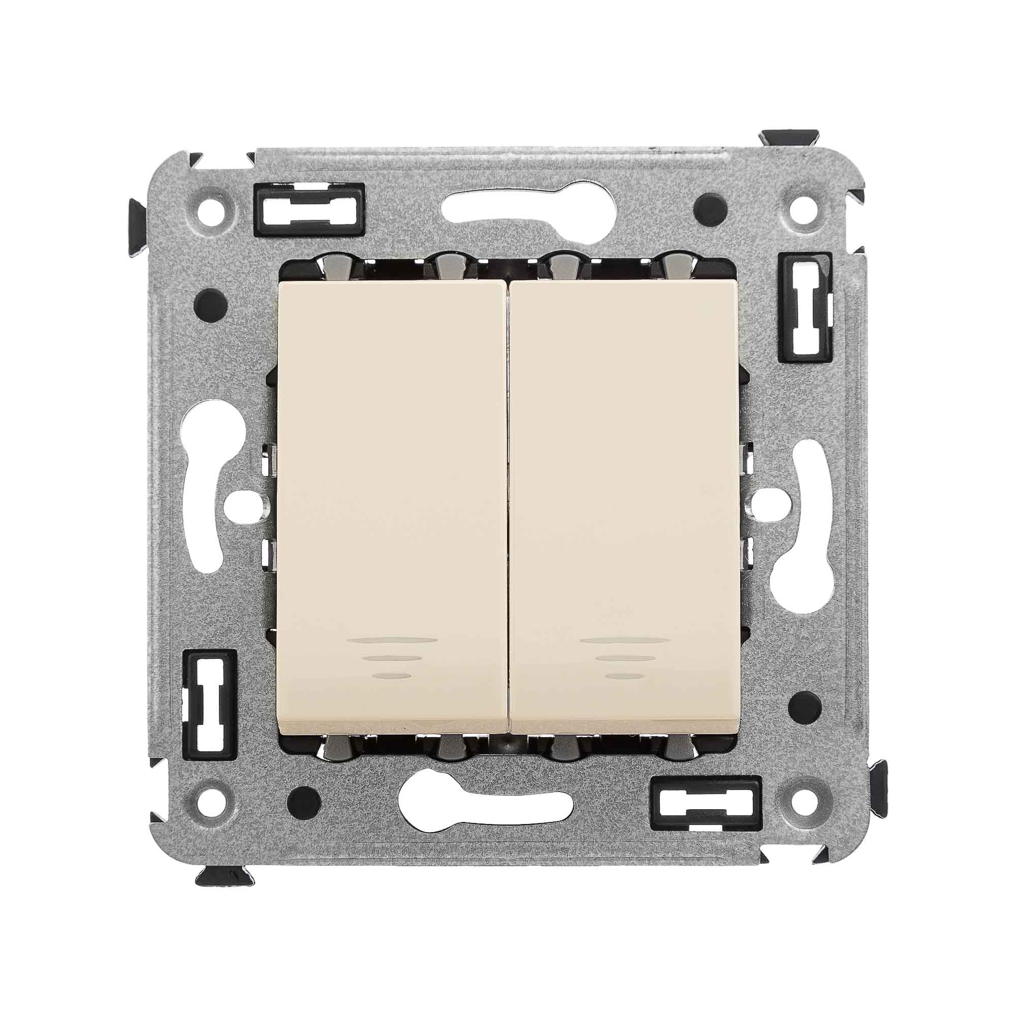 Кнопка двухклавишная. Назначение: для монтажа в подрозеточные коробки глубиной не менее 45 мм (код 59301). Используется в качестве кратковременного включения источника питания энергией. Характеристики: 2 модуля, диаметр отверстий для ввода кабелей – 3 мм (по 2 отверстия на одну клемму); винтовые зажимы; шаблон для зачистки кабеля – 11 мм; номинальный ток – 10 A; номинальное напряжение – 230 В; фиксация в подрозеточные коробки при помощи каркаса с лапками (код 4400802) и саморезов. Цвет: "Закаленная сталь".