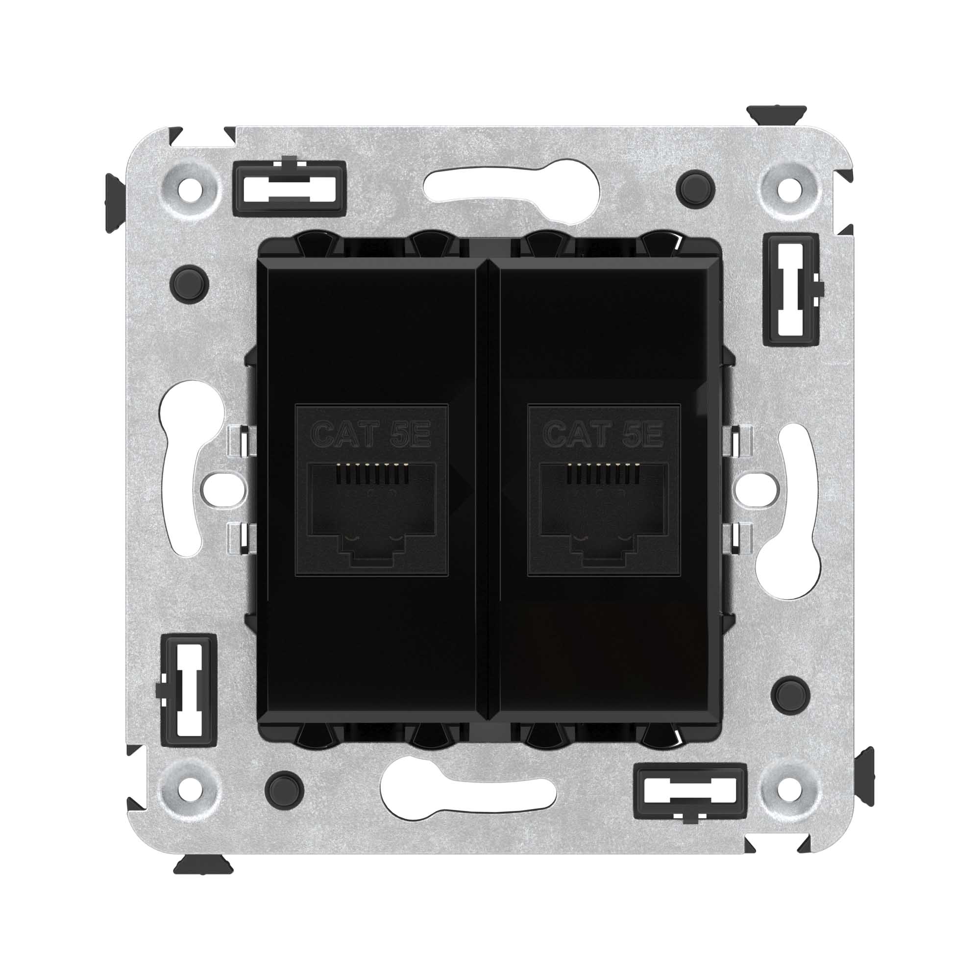 Компьютерная розетка двойная без шторки используется для подключения компьютерной техники и соединения с патч-панелью. Компьютерная розетка предназначена для скрытого монтажа в стену, поставляется в комплекте с суппортом. Розетка RJ-45 категории 5e – это наиболее популярная на сегодняшний день модель. Она позволяет организовать сеть с частотой 125 МГц и скоростью до 1000 Мбит/с. Материал – металл, термопласт. Пластиковые детали устройства имеют оттенок "Черный квадрат".