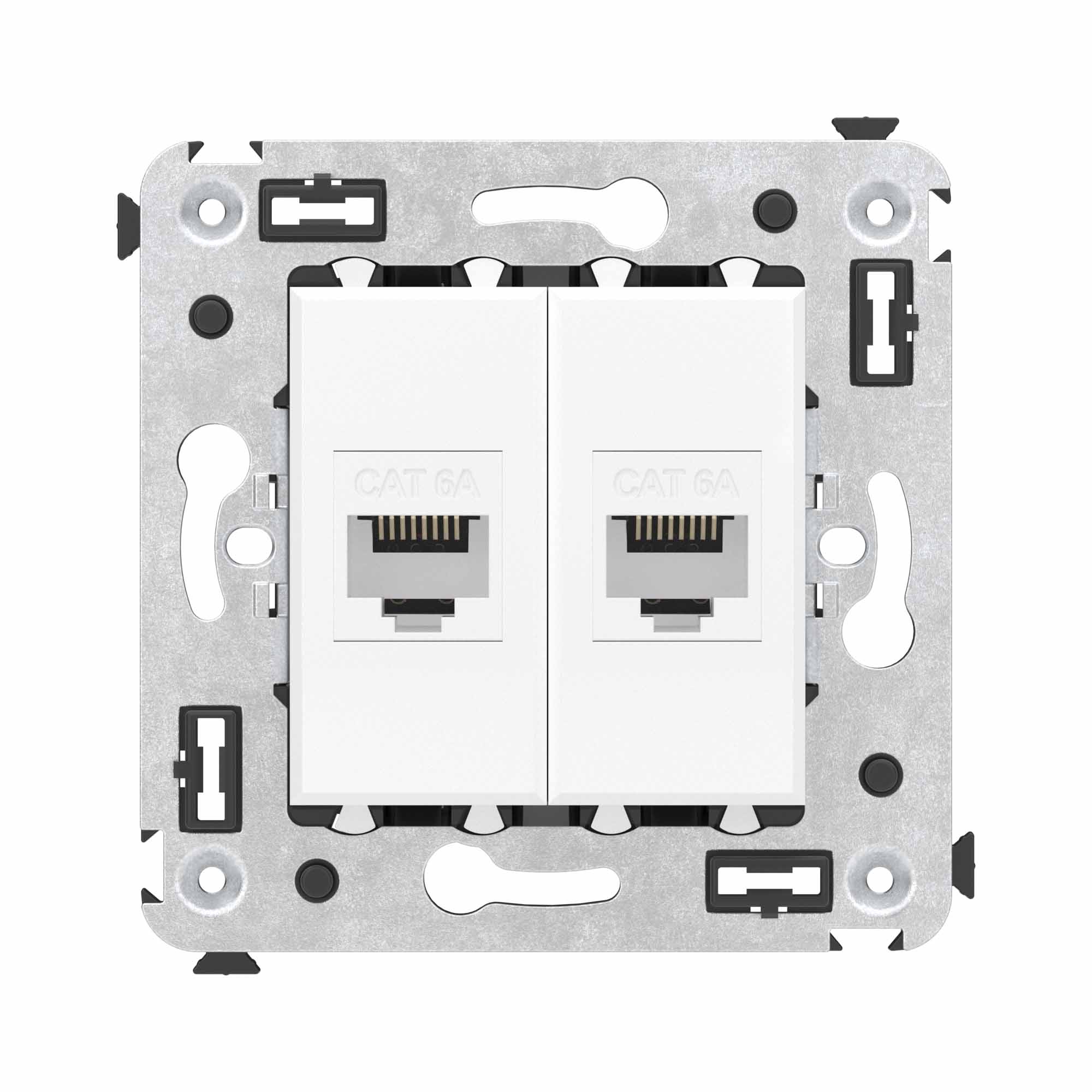 Компьютерная розетка двойная без шторки используется для подключения компьютерной техники и соединения с патч-панелью. Предназначена для скрытого монтажа в стену, поставляется в комплекте с суппортом. Розетка RJ-45 категории 6А может использоваться для организации сетей с частотой до 500 МГц и передавать данные до 10 Гбит/с. Материал розетки – металл, термопласт. Пластиковые детали изделия выполнены в цвете "Белое облако".