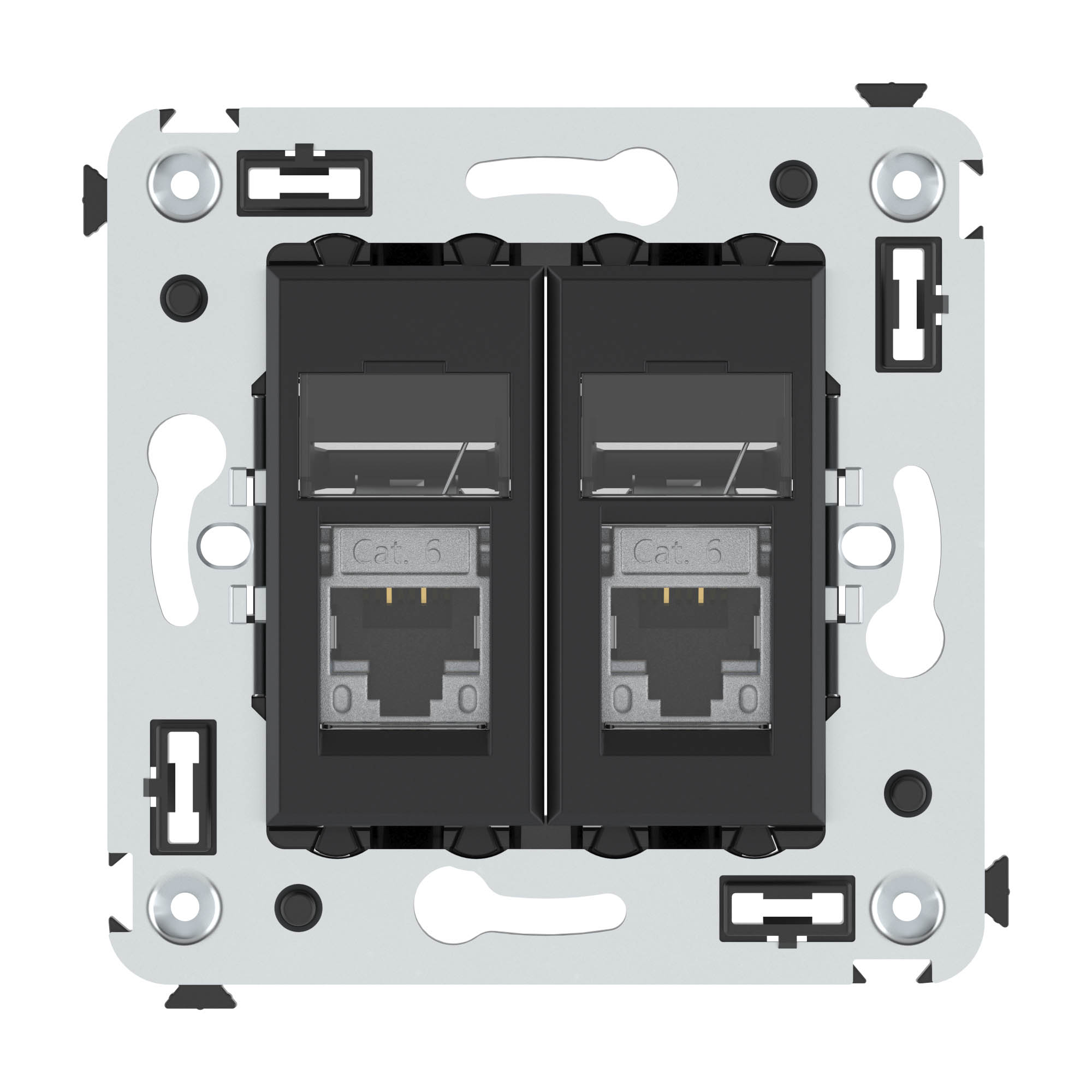 Компьютерная розетка RJ-45 в стену, двойная. Категория: 6, экранированная. Предназначена для монтажа в подрозеточные коробки глубиной не менее 45 мм (код 59301). Используется для подключения сетевого кабеля к рабочему месту. Характеристики: 8P8C; с пылезащитной шторкой; с маркировочной табличкой; заделка без инструмента. 2 модуля. Цвет: "Черный матовый".