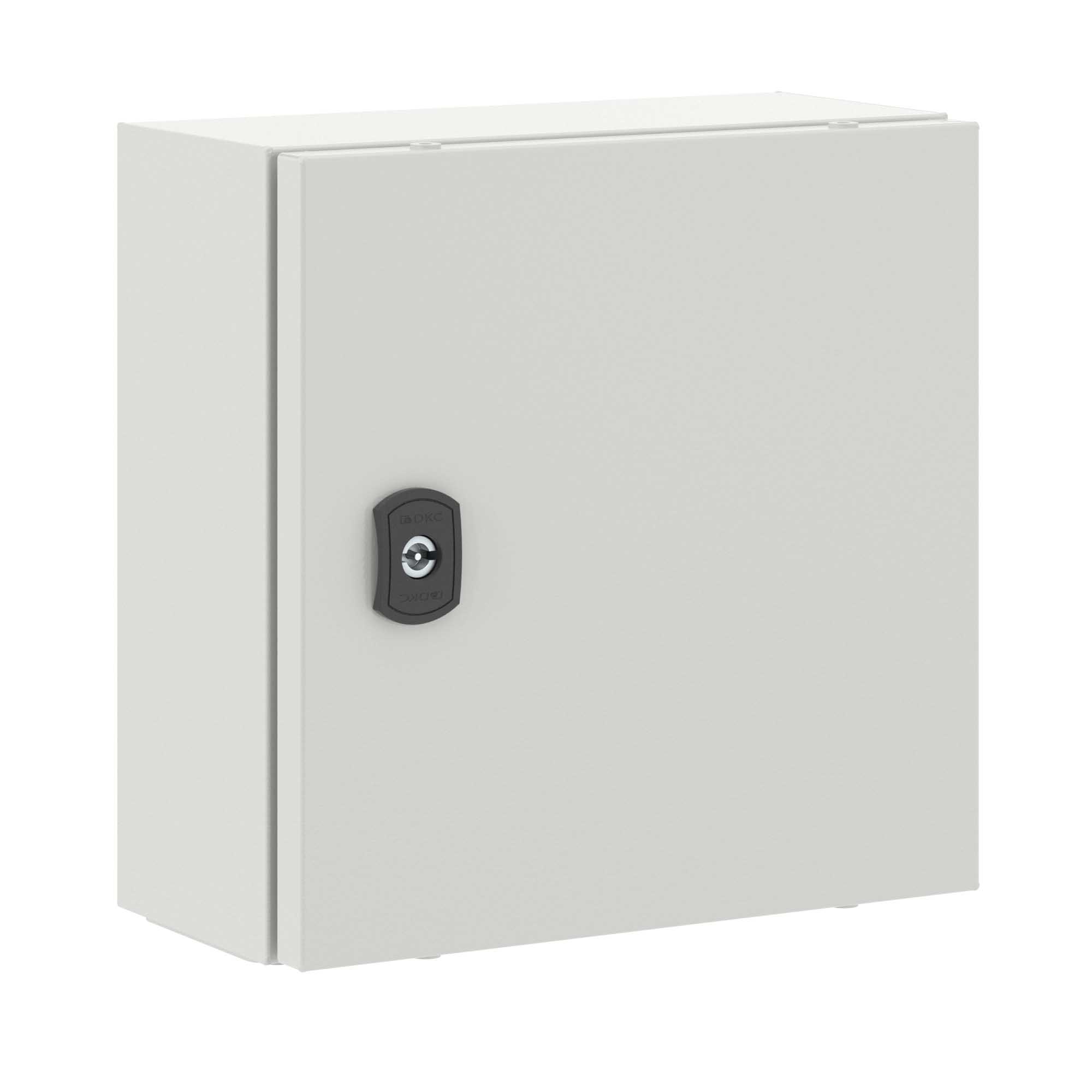 Навесные корпуса STE предназначены для систем автоматизации и распределения электроэнергии. Корпус, дверь, фланец STE изготавливаются из стали толщиной 1,5 мм с атмосферостойким порошковым покрытием, цвет RAL7035. Монтажная плата - из оцинкованной стали 1,8 мм. Корпуса выполнены по технологии сварки из единого листа металла, что обеспечивает высокую нагрузочную способность и защиту от вибраций. Степень защиты IP66, ударопрочность IK10, сейсмостойкость 9 баллов по шкале MSK-64, климатическое исполнение УХЛ1, ОМ2, ОМ3, группа горючести Г1. Комплект поставки: корпус, дверь реверсивная, монтажная плата, поворотный замок 1 шт., сплошной фланец для ввода кабеля 1 шт., комплект заземления с проводами заземления. Габариты 300x300x150 (ШхВхГ) мм.