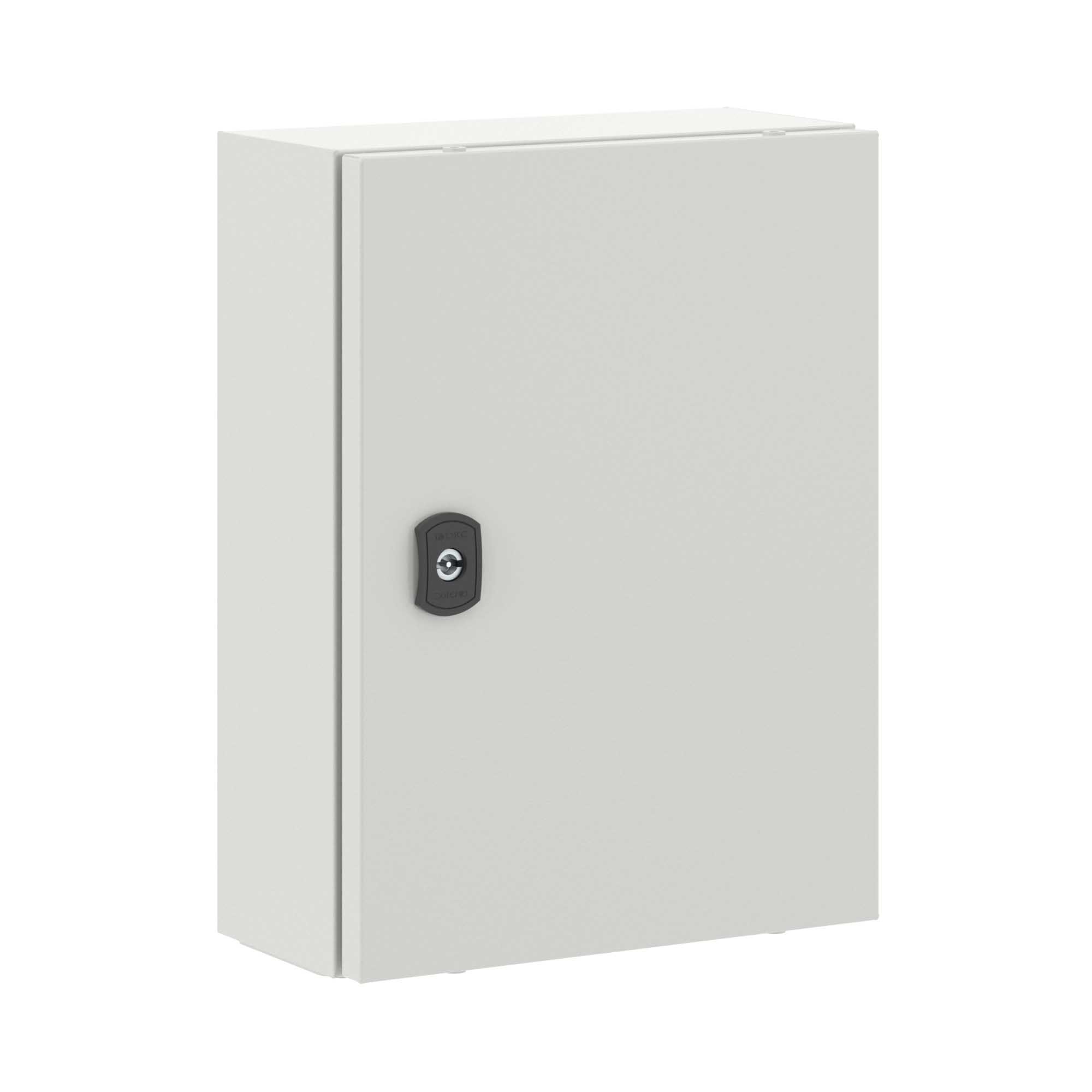 Навесные корпуса STE предназначены для систем автоматизации и распределения электроэнергии. Корпус, дверь, фланец STE изготавливаются из стали толщиной 1,5 мм с атмосферостойким порошковым покрытием, цвет RAL7035. Монтажная плата - из оцинкованной стали 1,8 мм. Корпуса выполнены по технологии сварки из единого листа металла, что обеспечивает высокую нагрузочную способность и защиту от вибраций. Степень защиты IP66, ударопрочность IK10, сейсмостойкость 9 баллов по шкале MSK-64, климатическое исполнение УХЛ1, ОМ2, ОМ3, группа горючести Г1. Комплект поставки: корпус, дверь реверсивная, монтажная плата, поворотный замок 1 шт., сплошной фланец для ввода кабеля 1 шт., комплект заземления с проводами заземления. Габариты 400x300x150 (ШхВхГ) мм.