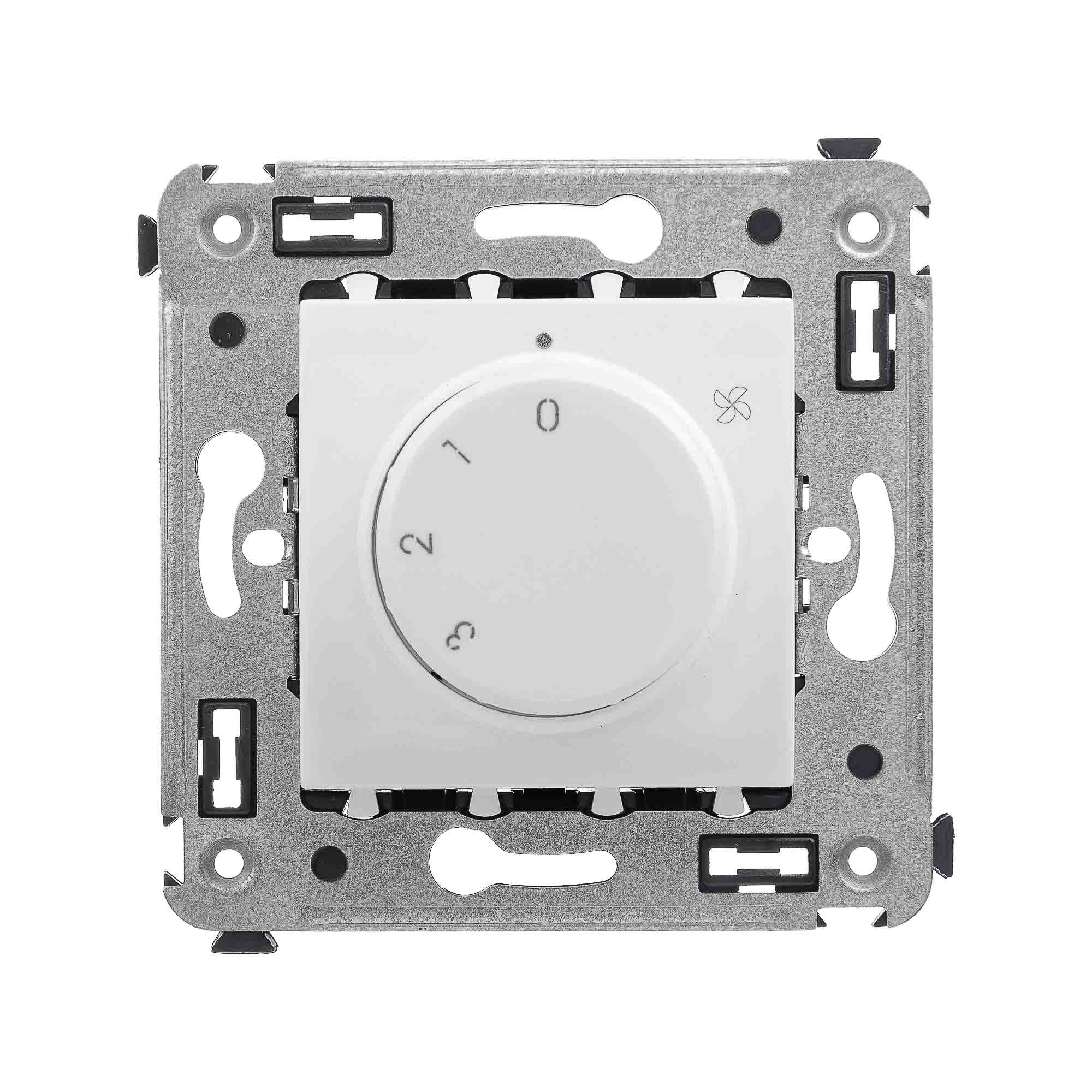 Механизм управления вентиляторами. Назначение: для монтажа в подрозеточные коробки глубиной не менее 45 мм (код 59301);. Предназначен для управления вентиляторами. Характеристики: номинальное напряжение – 230 В; 3 скорости работы; диаметр отверстий для ввода кабелей – 3 мм; винтовые зажимы; шаблон для зачистки кабеля – 11 мм; фиксация в подрозеточные коробки глубиной не менее 45 мм при помощи каркаса с лапками (код 4400802) и саморезов. Цвет: "Белое облако".