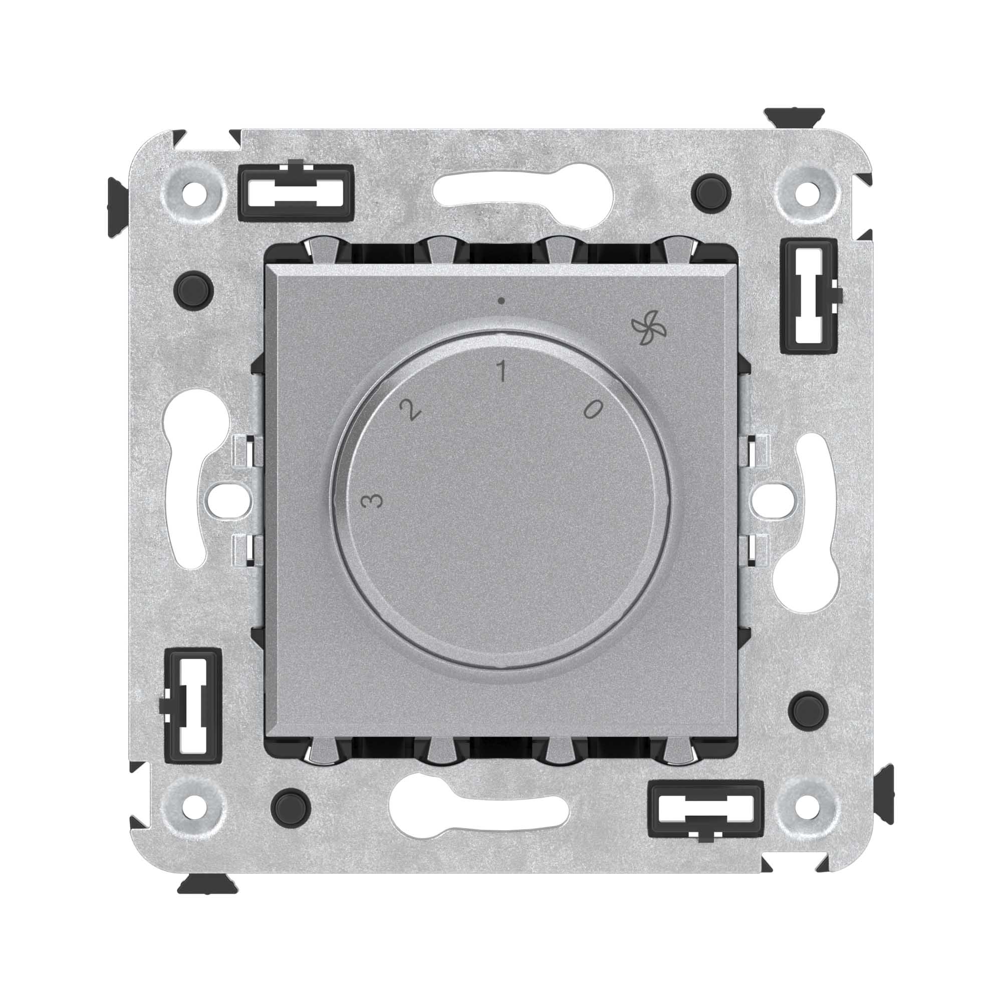 Механизм управления вентиляторами. Назначение: для монтажа в подрозеточные коробки глубиной не менее 45 мм (код 59301);. Предназначен для управления вентиляторами. Характеристики: номинальное напряжение – 230 В; 3 скорости работы; диаметр отверстий для ввода кабелей – 3 мм; винтовые зажимы; шаблон для зачистки кабеля – 11 мм; фиксация в подрозеточные коробки глубиной не менее 45 мм при помощи каркаса с лапками (код 4400802) и саморезов. Цвет: "Закаленная сталь".