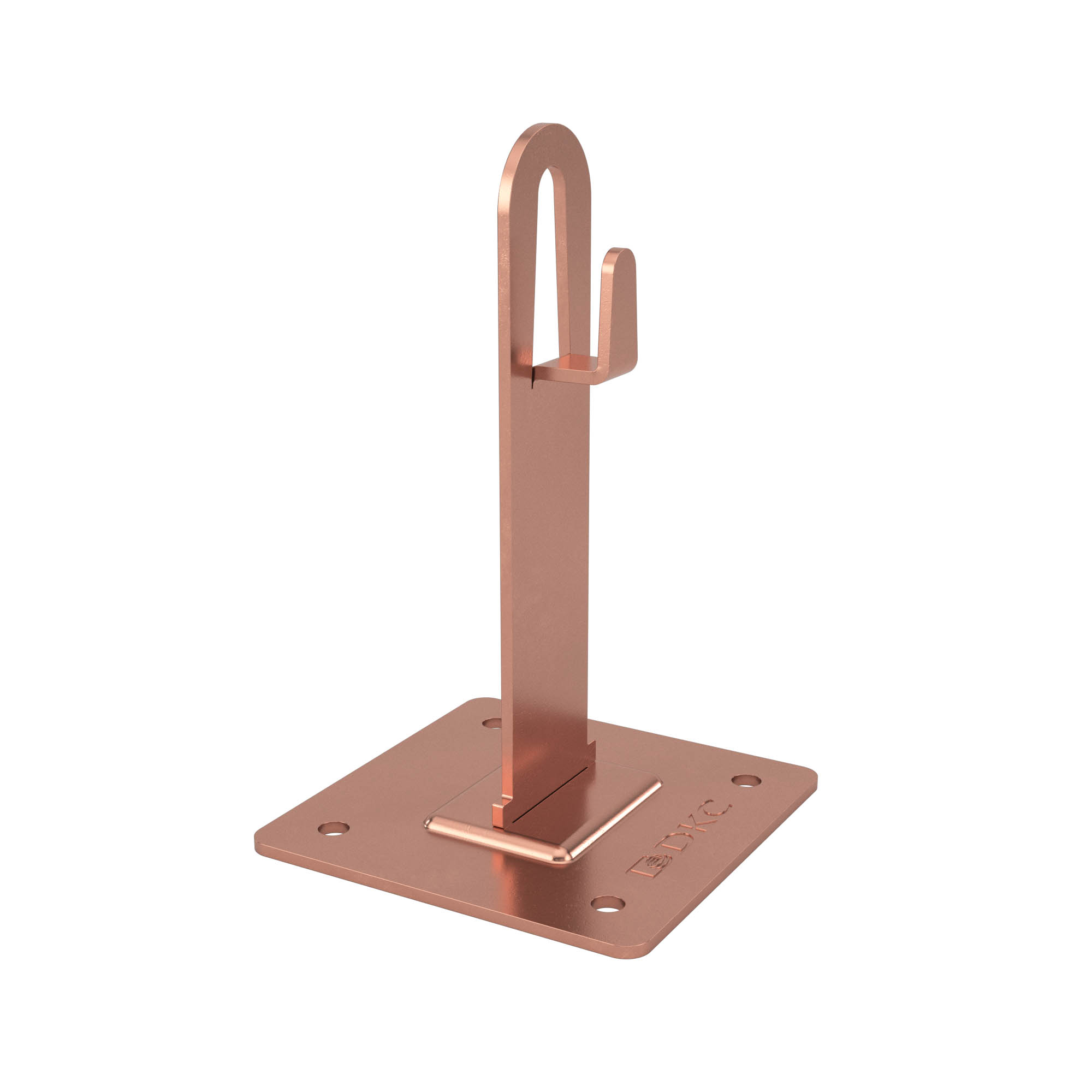 Металлический держатель используется для фиксации молниеприемной сетки на основе прутка диаметром 8-10 мм на плоской либо скатной кровле при помощи саморезов. Проводник крепится безвинтовым зажимом с применением плоскогубцев. Материал - медь, высота - 150 мм.