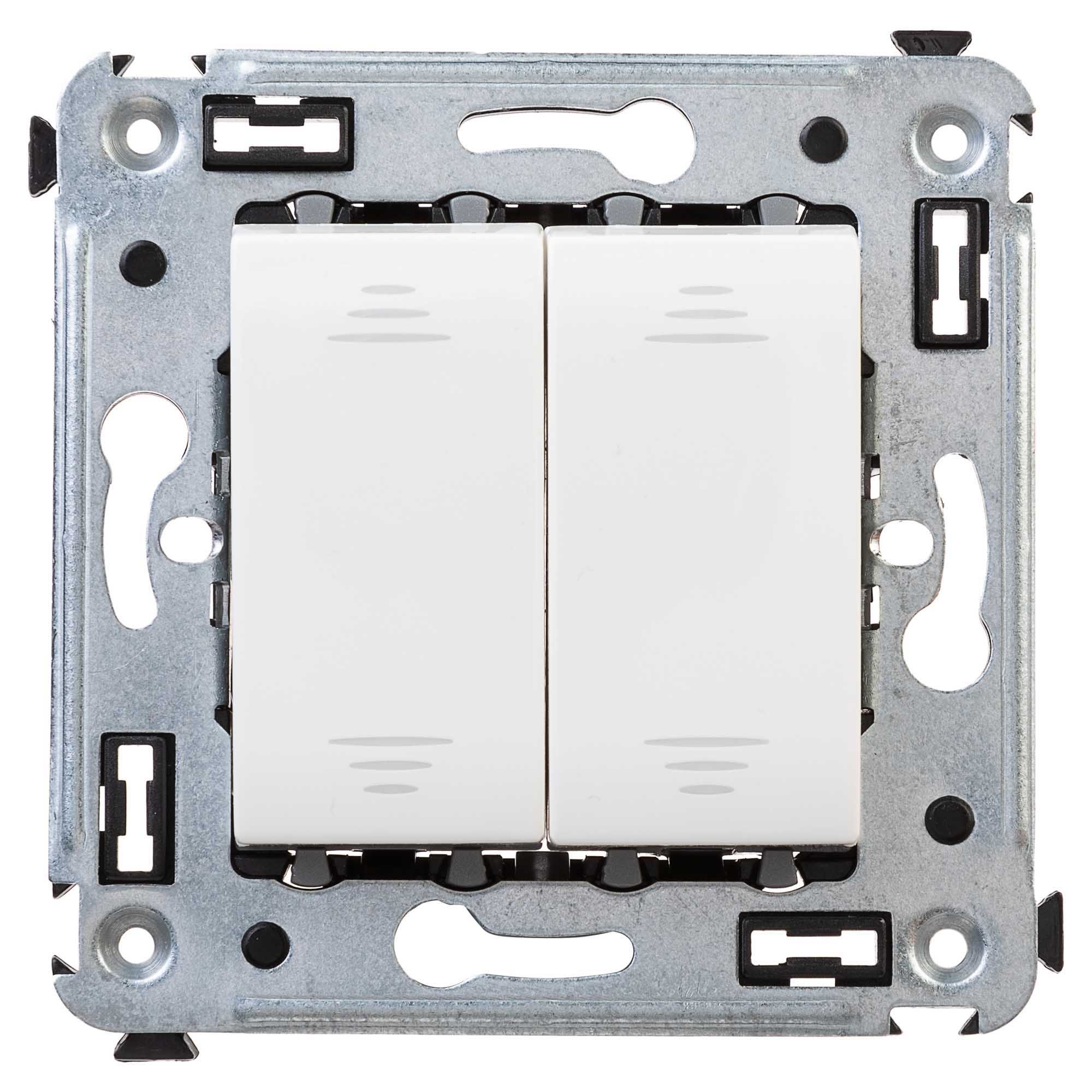 Задача двухклавишного переключателя – управление двумя контурами освещения из двух точек. Он позволяет включить/выключить освещение двумя светильниками из удобной точки – например, в спальне переключатель может размещаться возле кровати. Переключатель предназначен для скрытого монтажа в стену. Номинальное напряжение – 230 В, номинальный ток – 16 А.