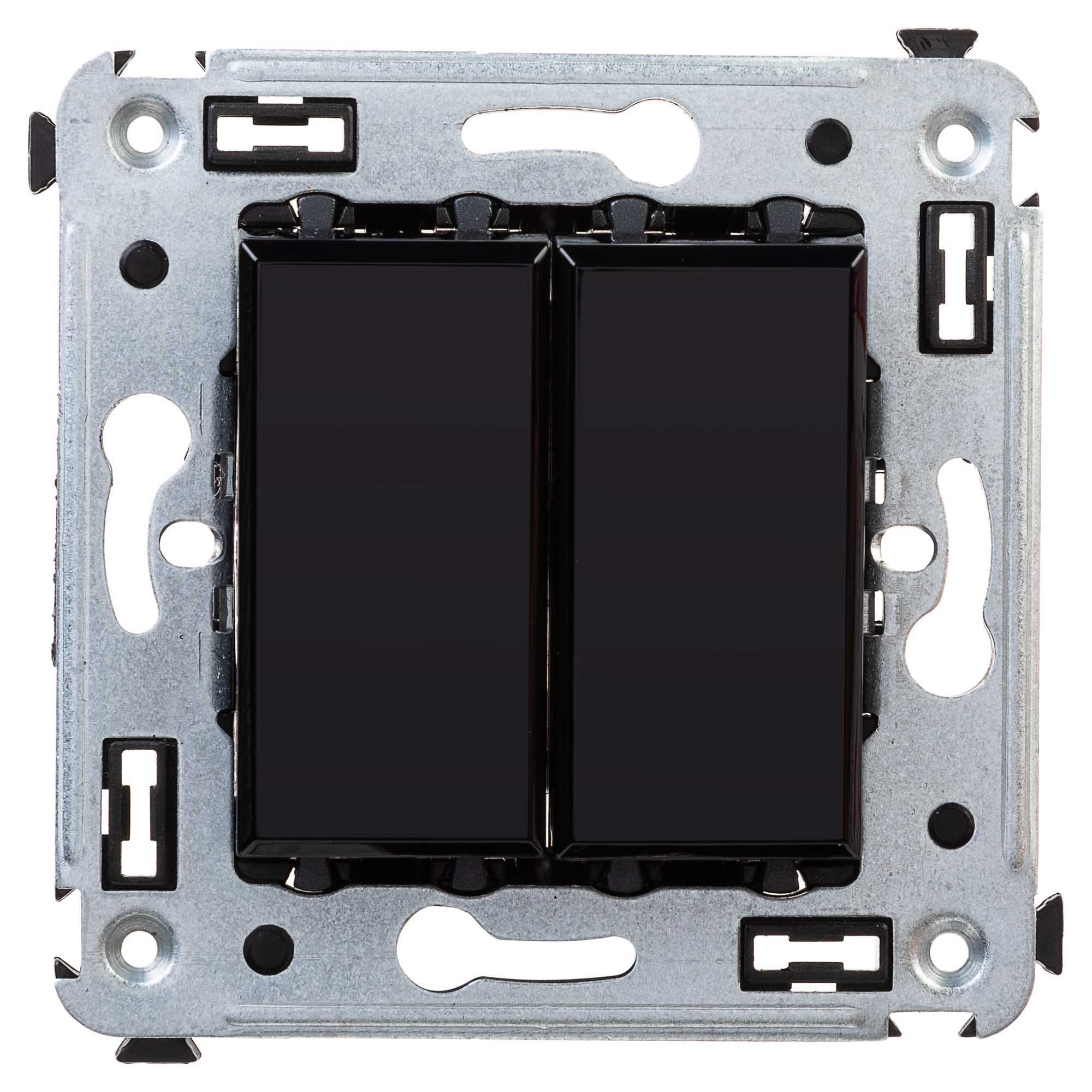 Задача двухклавишного переключателя – управление двумя контурами освещения из двух точек. Он позволяет включить/выключить освещение двумя светильниками из удобной точки – например, в спальне переключатель может размещаться возле кровати. Переключатель предназначен для скрытого монтажа в стену. Номинальное напряжение – 230 В, номинальный ток – 16 А.