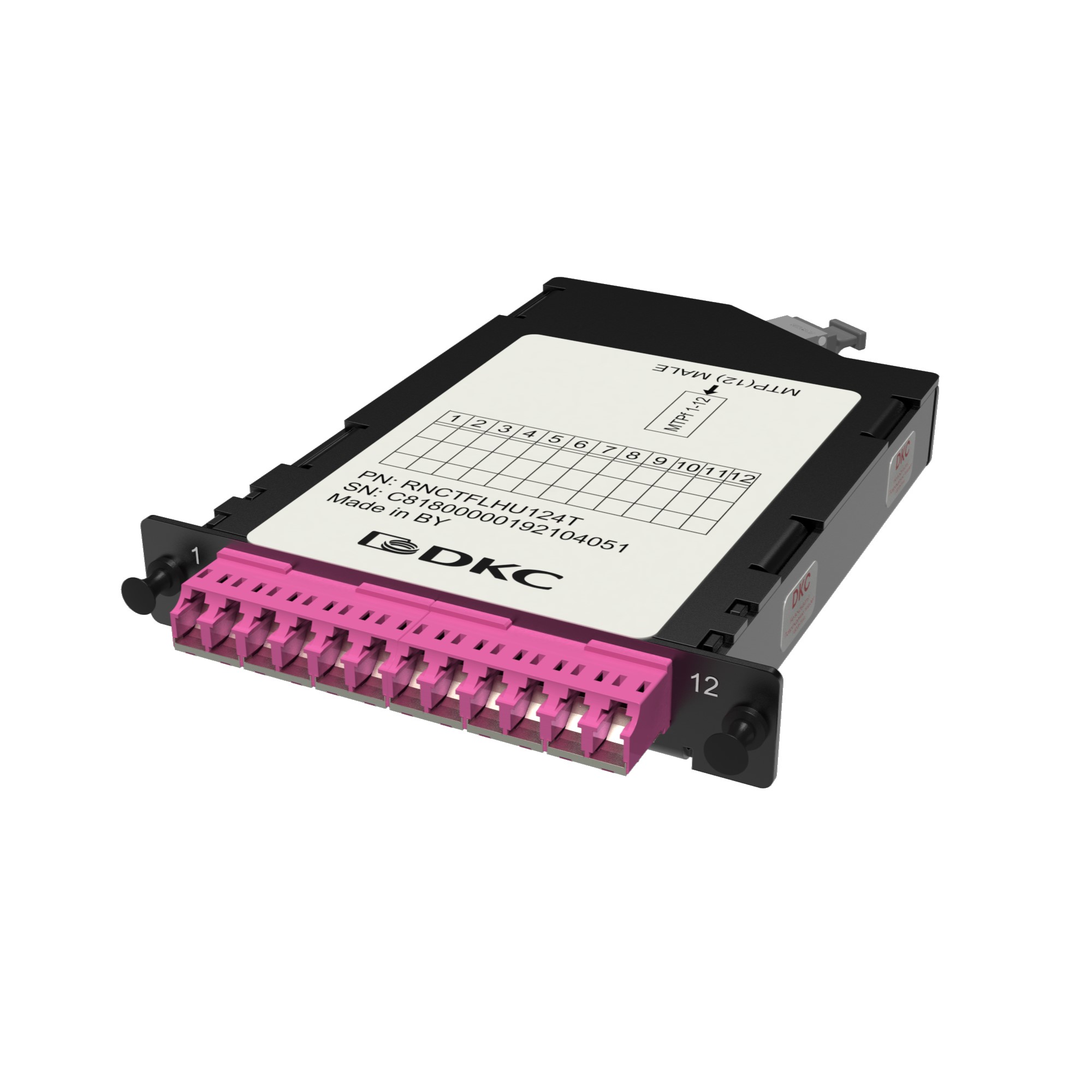 Претерминированная кассета половинной высоты (до 8 кассет в корпус RNMTP1U4M), 12 оптических одномодовых волокон 50/125 OM4, адаптер MTP(12) female для подключения транковой сборки с коннектором МТР UРС с тыльной стороны, 6 дуплексных адаптеров LC UPC (с защитными шторками) для подключения коммутационных (аппаратных) шнуров на лицевой стороне. Полярность прямая. Маркировочная таблица на верхней крышке корпуса кассеты.
